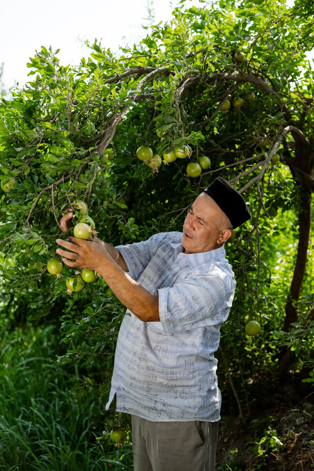 Um die Früchte vor der starken usbekischen Sonne zu schützen, werden sie während der Reifezeit einzeln mit Papier umwickelt, ein aufwändiger, von Hand ausgeführter Arbeitsschritt. Die Ernte erfolgt druch die Mitglieder der Kooperative Dustkul Bogi, die seit 2012 Bio- und Fairtrade-zertifiziert ist. Reife Granatäpfel können bis zu 2 Kilogramm schwer werden und sind echte regionale Besonderheiten.